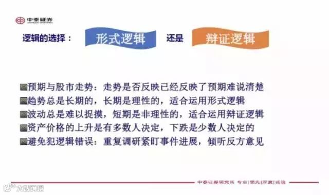 辩证法是国人最擅长的思维方法,如物极必反、分久必合、合久必分等。股市从短期波动来看,也符合辩证法,涨多了要跌、跌多了要涨,我们非要寻找涨了是什么原因,跌了是什么原因,何苦呢?跌的原因就是因为涨多了嘛,涨的原因就是因为跌多了嘛,其实很简单。我认为对股市的长期分析要用形式逻辑,即成长性决定股价,所以要用演绎法,短期波动用辩证法。