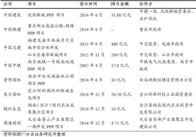 随着政策推广力度的加大以及具体PPP 项目操作规范的不断完善,国内建筑工程上市公司纷纷试水PPP 模式,包括基建领域的中国建筑、中国铁建、中国交建、中国中铁、龙元建设,园林工程领域的普邦园林、东方园林、铁汉生态,水利方面的围海股份,均开始尝试PPP 模式。
