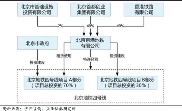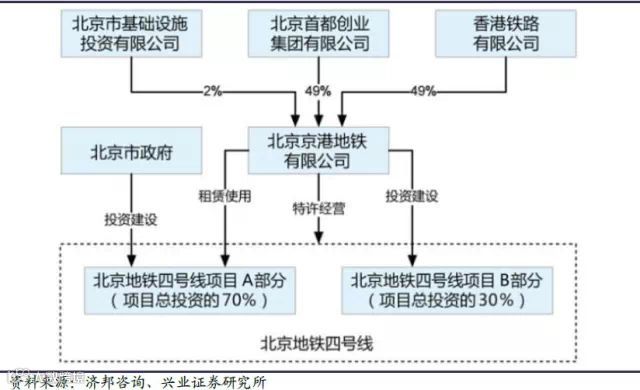 北京市政府及其控制的国有企业引入港铁公司,设立特许经营公司:北京基投、首创集团和港铁公司共同出资设立京港地铁,其中港铁股份为49%,首创股份占比为49%,京投占比为2%。作为特许经营公司的京港地铁,投资46 亿元建设项目B 部分(占项目总投资的30%),并作为B 部分项目建成的运营管理主体。