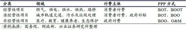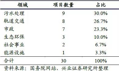 国务院近期发布的《关于创新重点领域投融资机制鼓励社会投资的指导意见》中重点提到了生态环保、农业水利、市政设施、交通、能源设施、信息和民用空间设施、社会事业等七个重点领域。财政部发布的30 个政府和社会资本合作模式(PPP)示范项目则重点推介了供水、供暖、污水处理、垃圾处理、环境综合整治、交通、新能源汽车、地下综合管廊、教育、医疗、体育等多个领域。从项目所在的行业来看,主要集中在污水处理、轨道交通、供水、供暖等以“使用者付费”为特征的经营性项目。这类项目收益相对较高且较为稳定,有利于吸引社会资本参与。