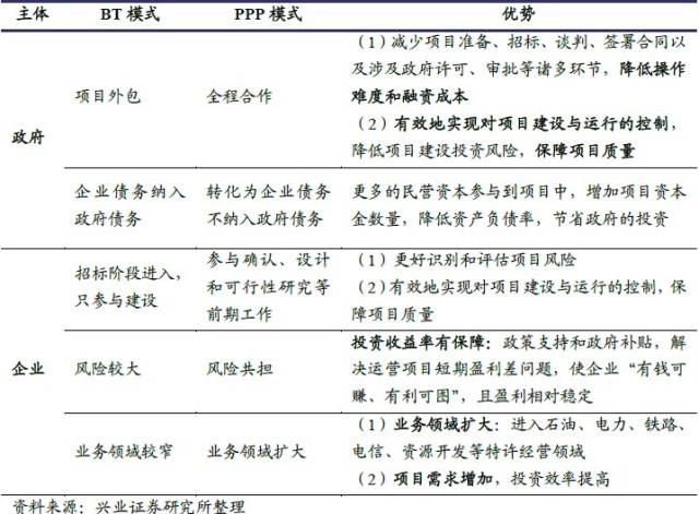 PPP 模式相比以往的BT、BOT,更强调公私部门全过程合作,利益共享,风险共担。通过引入市场竞争和激励约束机制,发挥双方优势,提高公共产品或服务的质量和供给效率,达到多方共赢的效果。PPP 模式的推广,将对政府和私人企业参与基础设施建设产生较大的影响,未来有望成为公共基础设施建设领域里主流的商业模式。