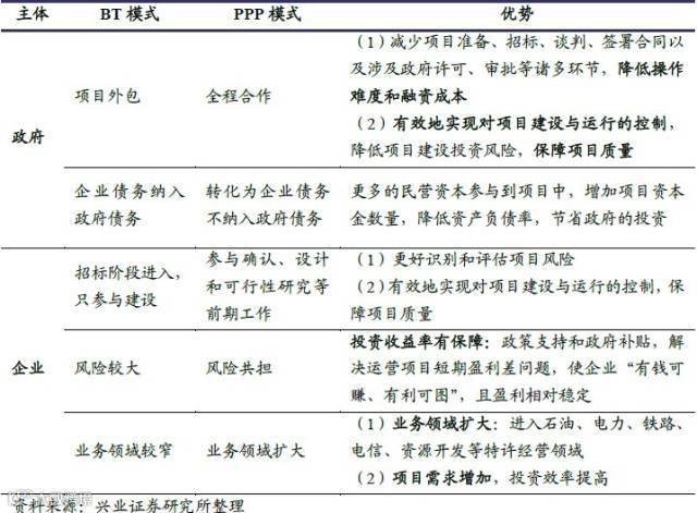 与现阶段的BT 模式相比,PPP 模式在合作关系、民营企业进入时间、支付方式、政府参与程度、风险分担、融资渠道和成本等多方面存在差别。