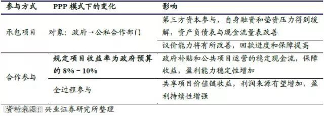 项目需求增加,业务领域将有所扩大:PPP 模式作为新的融资手段在加大推广后有望在较大程度上缓解地方债务对基建投资需求的约束,项目需求将增加;同时PPP 模式通过特许经营权的授予,其所应用的业务领域,可从传统的基建、城市公共事业及公共交通领域逐步扩展到电力、医院医疗、文化、旅游等基础设施领域,企业的业务发展有望大幅扩大。
