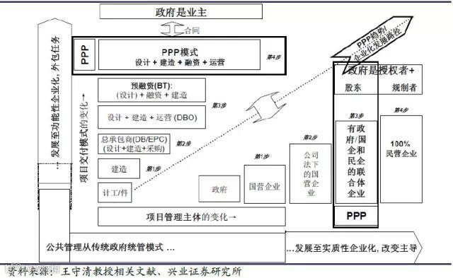 从融资模式和控制主体的变化来看,政府提供基础设施主要有两条发展路径,分别为功能性和实质性的路径。功能性的路径主要反映项目支付模式的变化:“政府出钱,企业施工→工程总承包(DB/EPC)→预融资(BT)→PPP 模式(狭义)”,实质性的路径主要反映的是项目控制主体的变化(企业化):“政府控制→央企国企负责→私企参与→政府和私人企业联合参与”,目前我国已经发展到第二和第三步了,私企可以参与,同时国企按照法人企业经营项目,但仍具有一定的垄断性。