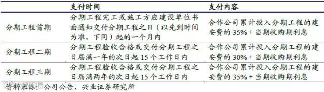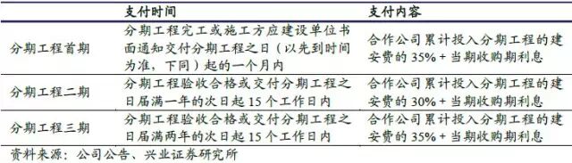 普邦园林作为施工方,按施工进度获得建安工程进度款。工程分期验收,每一期交付后,业主分三期向合作公司支付工程收购款,包括“合作公司支付的建安费用+投资回报+建设期利息+回购期利息”。