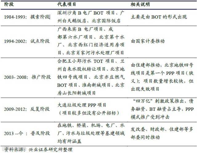 我国广义PPP 模式最早可追溯到1984 年,以深圳沙角B 电厂的BOT 项目模式开始引入到基建领域。此后PPP 模式在我国的发展主要经历了五个阶段。狭义PPP模式开始于2004 年的北京地铁四号线项目,此后得到不断推广,但“四万亿”刺激政策推出使债务融资成为地方政府基建融资的优先选择,PPP 模式需求受到冲击。到近几年地方债务风险逐渐暴露,PPP 模式开始受到地方政府重视,应用领域也开始逐渐扩大。