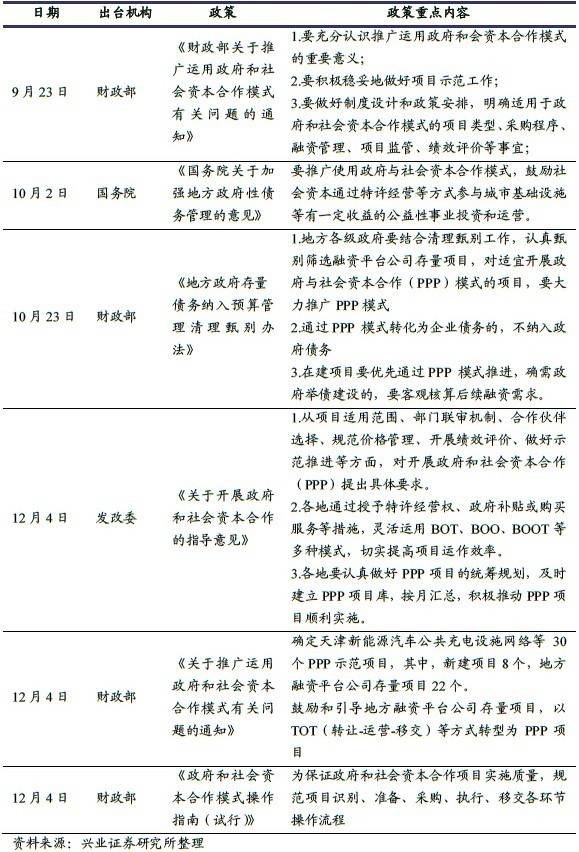 今年8 月份以来,重庆、江苏、安徽、福建、青海等地先后发布了首批PPP 试点项目计划,各省计划投资额都在千亿左右级别。据不完全统计,国家层面和地方政府今年以来推出的PPP 项目已达近8000 亿元。目前首批PPP 项目开始进入项目准备及采购等实施阶段,随着明年地方政府基建项目计划的制定,PPP 项目将大量涌现。