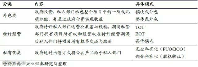 广义的PPP泛指公共部门和私人部门为提供公共产品和服务而建立的各种合作关系,可分为外包、特许经营和私有化三大类。其可以理解为一系列项目融资模式的总称,包含BOT、TOT、DBFO 等多种模式。