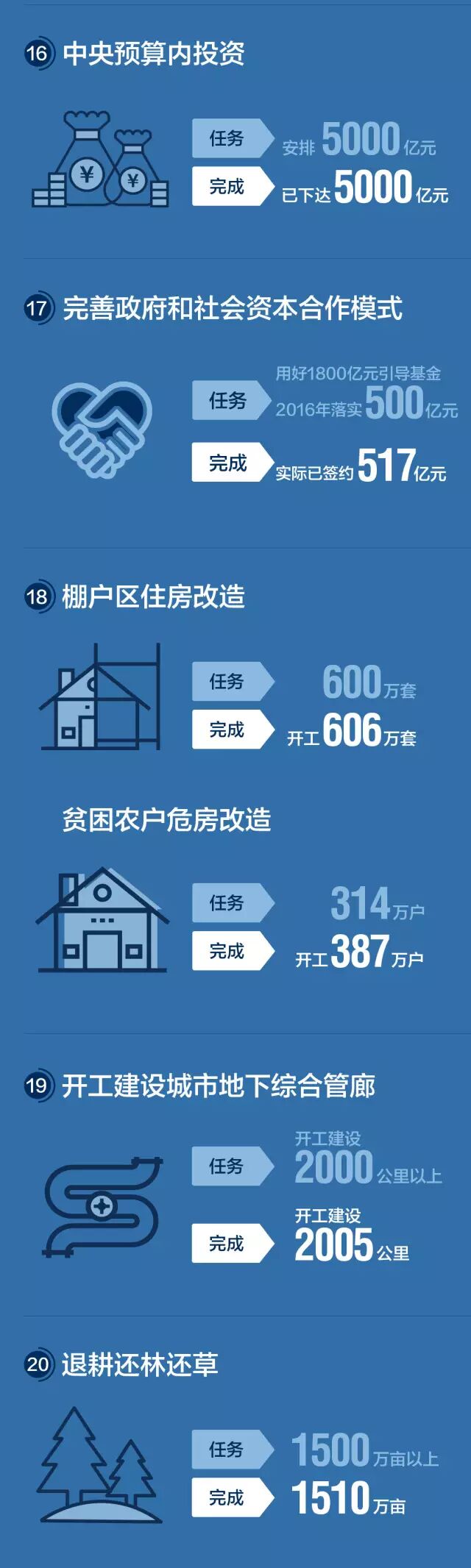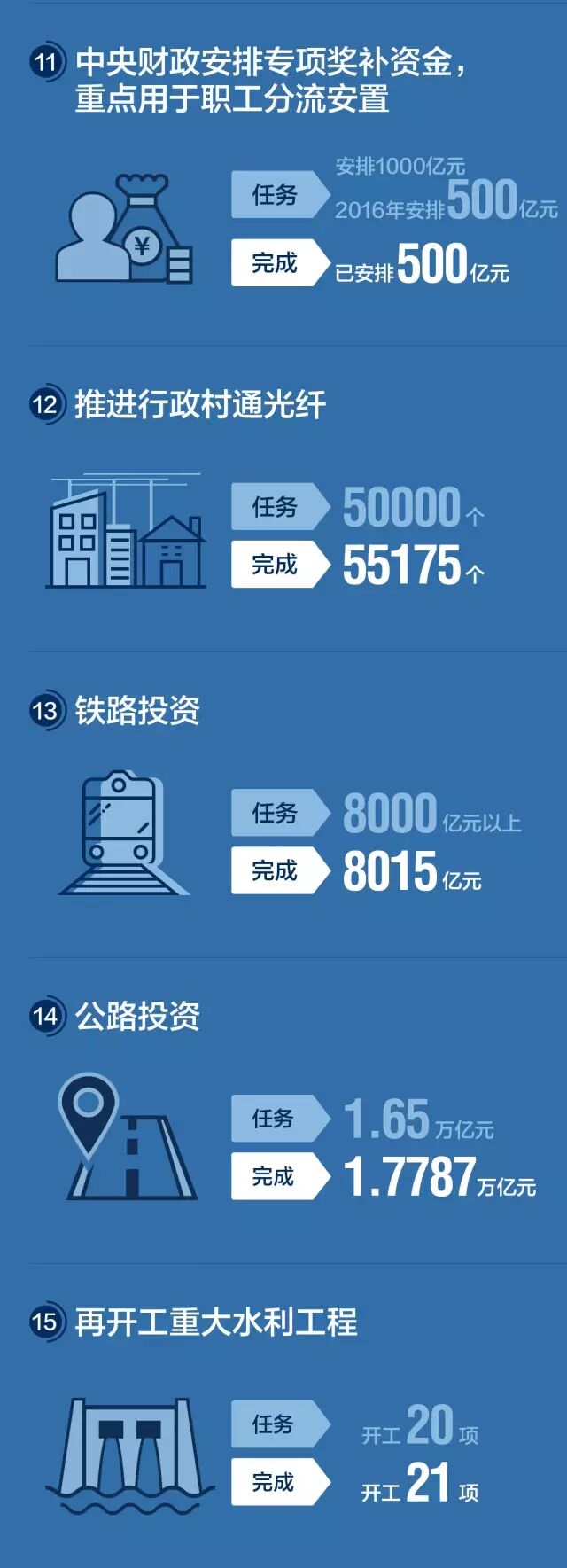报告在“2017年重点工作任务”中明确:积极扩大有效投资。引导资金更多投向补短板、调结构、促创新、惠民生的领域。今年要完成铁路建设投资8000亿元、公路水运投资1.8万亿元,再开工15项重大水利工程,继续加强轨道交通、民用航空、电信基础设施等重大项目建设。