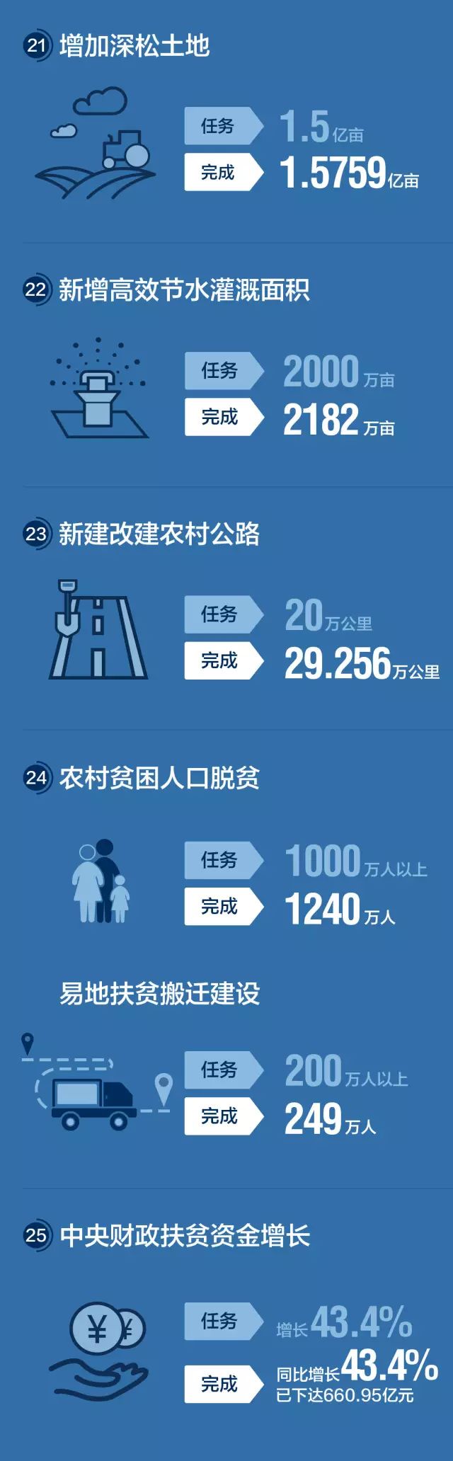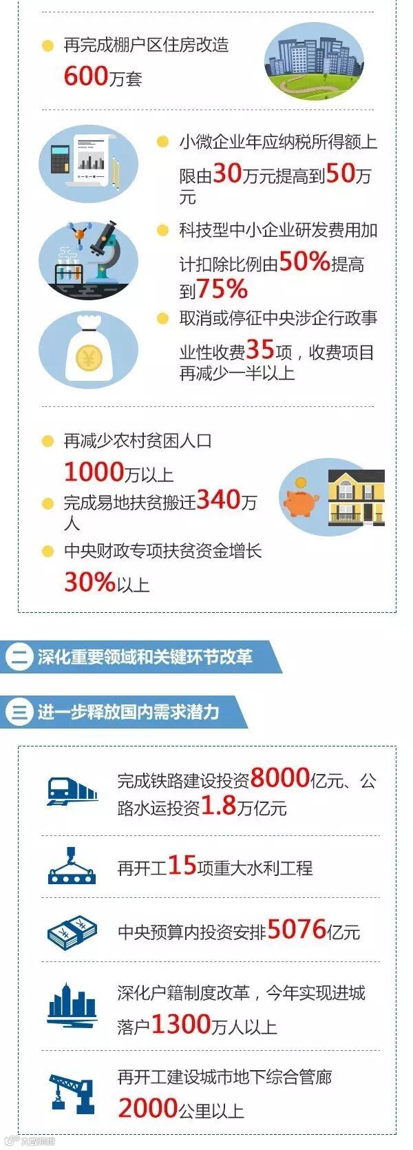 报告在“2017年重点工作任务”中明确:贫困地区和贫困人口是全面建成小康社会最大的短板。要深入实施精准扶贫精准脱贫,今年再减少农村贫困人口1000万以上,完成易地扶贫搬迁340万人。中央财政专项扶贫资金增长30%以上。加强集中连片特困地区、革命老区开发,改善基础设施和公共服务,推动特色产业发展、劳务输出、教育和健康扶贫,实施贫困村整体提升工程,增强贫困地区和贫困群众自我发展能力。推进贫困县涉农资金整合,强化资金和项目监管。创新扶贫协作机制,支持社会力量参与扶贫。切实落实脱贫攻坚责任制,实施最严格的评估考核,严肃查处假脱贫、“被脱贫”、数字脱贫,确保脱贫得到群众认可、经得起历史检验。