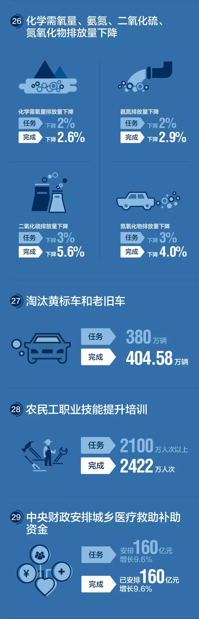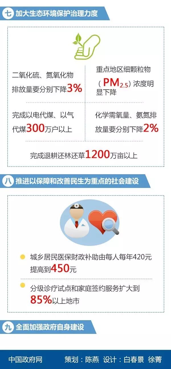 报告在“2016年工作回顾”中明确:加强生态文明建设,绿色发展取得新进展。制定实施生态文明建设目标评价考核办法,建设国家生态文明试验区。强化大气污染治理,二氧化硫、氮氧化物排放量分别下降5.6%和4%,74个重点城市细颗粒物(PM2.5)年均浓度下降9.1%。优化能源结构,清洁能源消费比重提高1.7个百分点,煤炭消费比重下降2个百分点。推进水污染防治,出台土壤污染防治行动计划。开展中央环境保护督察,严肃查处一批环境违法案件,推动了环保工作深入开展。