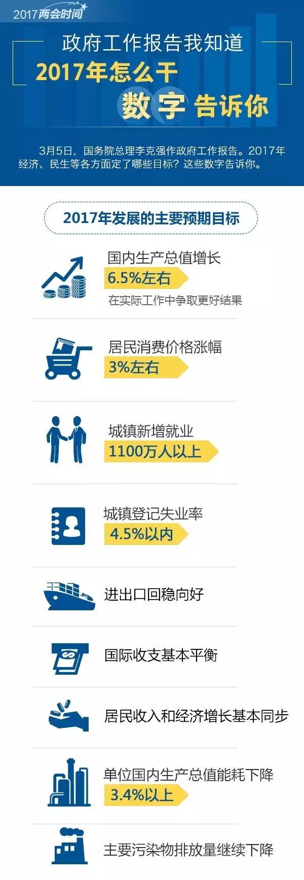 报告在“2017年工作总体部署”中明确:今年发展的主要预期目标是国内生产总值增长6.5%左右,在实际工作中争取更好结果。