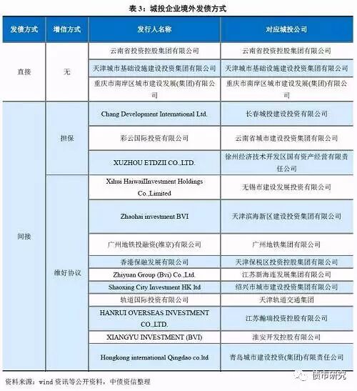 一般来说,境内企业在境外发债可以采取直接发债和间接发债两种方式,直接发债即以境内企业作为发债主体,直接在境外发行债券;间接发债是指以其在境外的子公司或特殊目的公司(SPV)作为发债主体进行发债。根据《国家计委、中国人民银行关于进一步加强对外发债管理的意见(2000年2月23日)》,直接发债的监管要求很高,发行难度很大,因此采取直接发债的企业较少。在已发境外债的城投企业中,仅云南省投资控股集团有限公司、天津城市基础设施建设投资集团有限公司和重庆市南岸区城市建设发展(集团)有限公司等三家企业采取直接形式发债。
