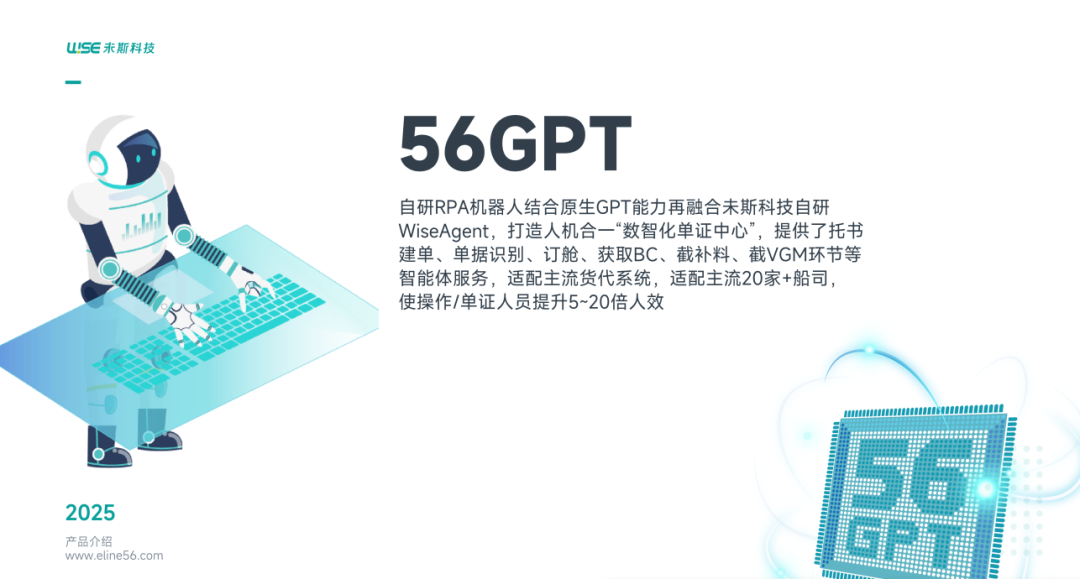 自研RPA机器人结合原生GPT能力再融合未斯科技自研Co-Wise物流大数据训练模型,打造人机合一“数智化单证中心”,提供了托书建单、单据识别、订舱、获取BC、截补料、截VGM等环节智能体服务,适配主流货代系统和20家+船司,使操作|单证人员提升5~20倍人效。