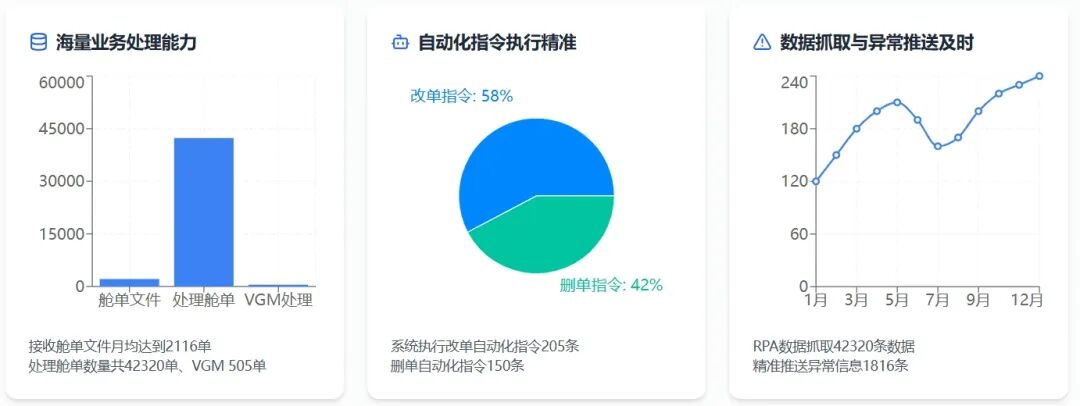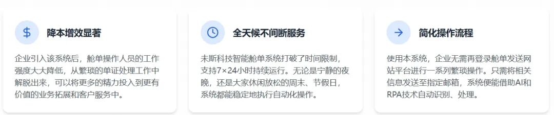 未斯科技创新性地将 AI 大模型的认知决策能力与 RPA 技术的自动化执行优势深度耦合,紧密贴合巴士悦信舱单业务高频复杂场景需求,量身打造 "智能舱单 Agent"。该方案以智能化、自动化的颠覆性创新,重构舱单操作流程,其落地应用成效显著如下: