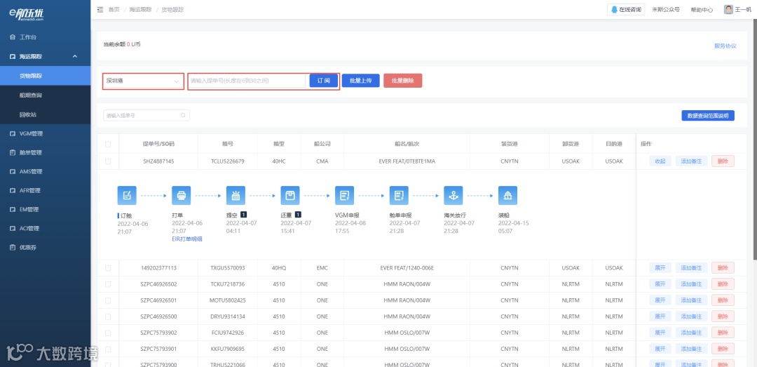 使用这个系统功能,你可以查询自己从华南地区港口出发的货物状态。