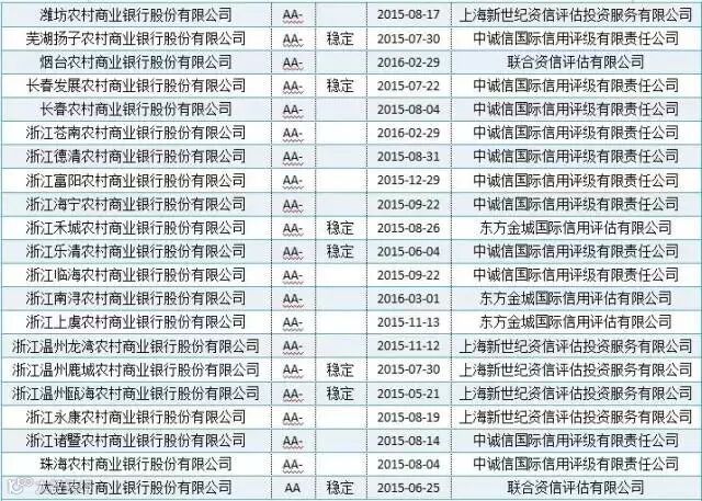 四、农村商业银行:145家,其中AAA评级3家;AA+评级6家;AA评级25家;AA-评级47家;A+评级50家;A评级13家;A-评级1家