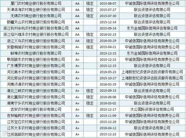 五、农村合作银行:13家,其中AA评级2家;AA-评级5家;A+评级5家;A评级1家