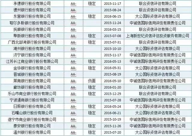 三、城市商业银行:100家,其中AAA评级9家;AA+评级25家;AA评级37家;AA-评级26家;A+评级3家