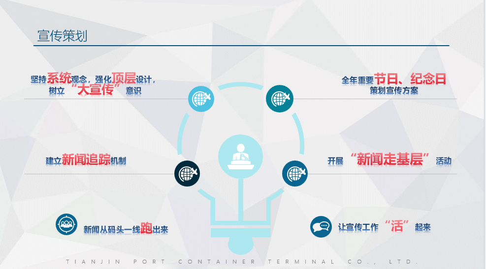 天津TCT码头党群工作部长张娜分享了TCT在宣传策划、宣传角度、宣传技术创新、文化宣传、宣传队伍等5个维度的措施与成效。