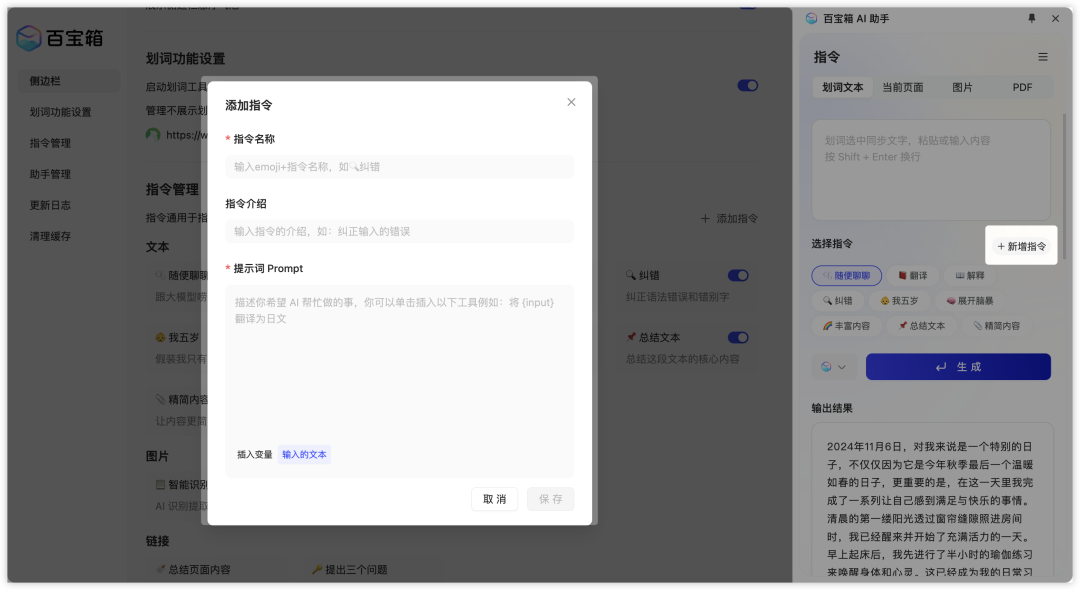 每个人的需求和习惯都独一无二,而「百宝箱 AI 助手」不仅仅是个自动化工具,更是个能贴近你工作习惯的智能助手。你可以自己设置指令,比如给常用任务设专属提示词,一键触发相应的服务,让效率提升不止一点点。