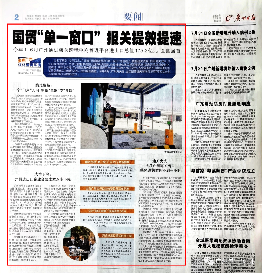 记者了解到,今年以来,广州在打造国际贸易“单一窗口”的基础上,优化通关流程、提升通关效率、降低口岸合规成本,力争让数据多跑路,让群众少跑腿,持续推进优化口岸营商环境,促进跨境贸易便利化。据统计,今年1-6月,广州通过海关跨境电商管理平台进出口总值175.2亿元,占全国105个跨境电商综合试验区进出口总值约20%,位列全国首位。今年6月,广州海关进、出口整体通关时间与2017年相比分别压缩84.92%和92.82%。