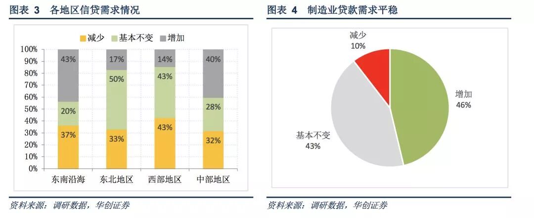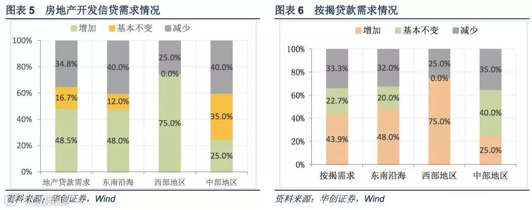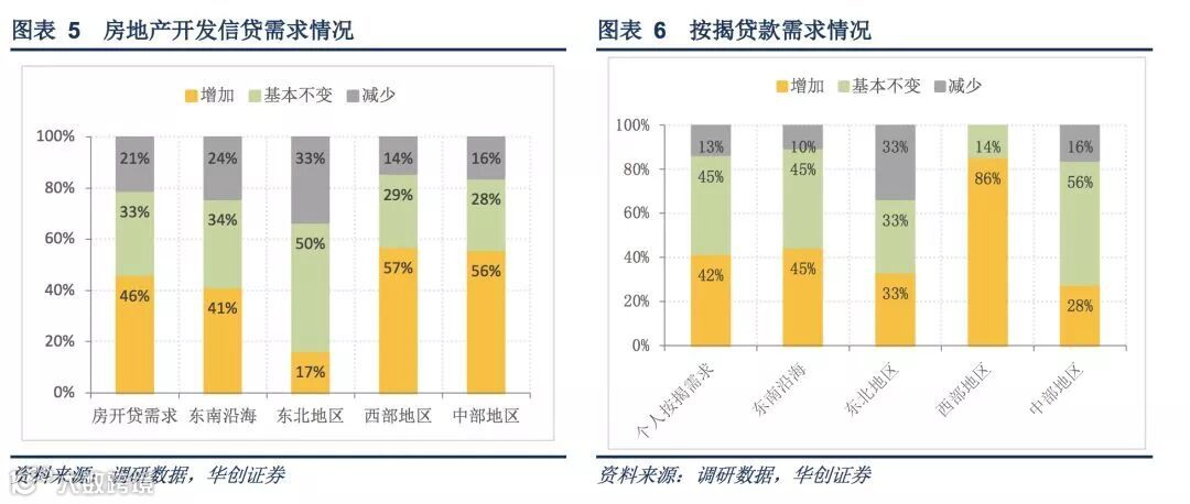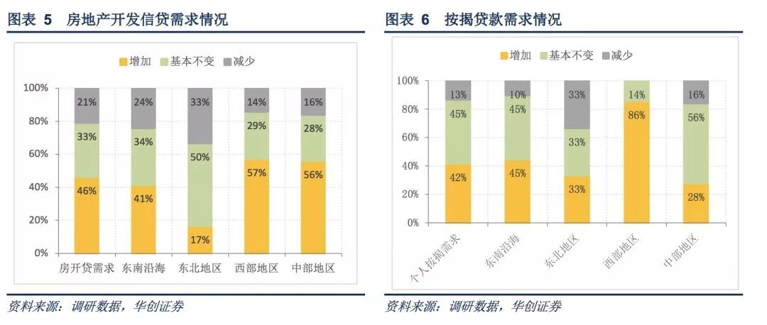 2)中部、东南沿海、西部与东北地区的信贷需求依次回落。中部、东南沿海信贷官中有65%和60%认为一季度信贷需求较2017年4季度进一步上行,而西部和东北地区有58%和50%的信贷官这么认为。