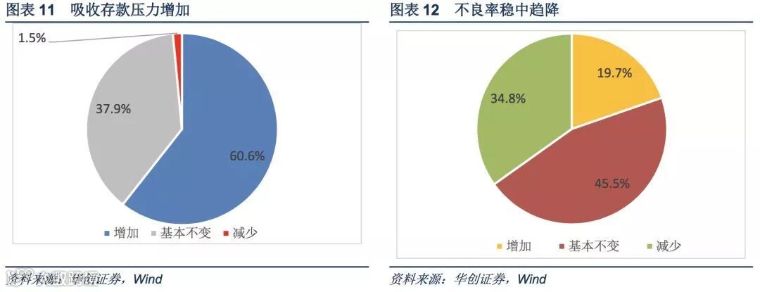 61%的信贷官表示,一季度吸储压力较去年四季度上行。分银行类型来看,五大行及农商行吸储压力相对较小,而股份行和城商行分别有75%和67%的信贷官表示吸储压力进一步上升。某城商行信贷官表示:“其战略中心将放在对小、散、微客户的争夺,大象已经能搬都搬了,现在要多搬蚂蚁”。伴随资管新规的持续推进,短期内或造成表外理财回流表内存款,但现在这种情况还不明显。
