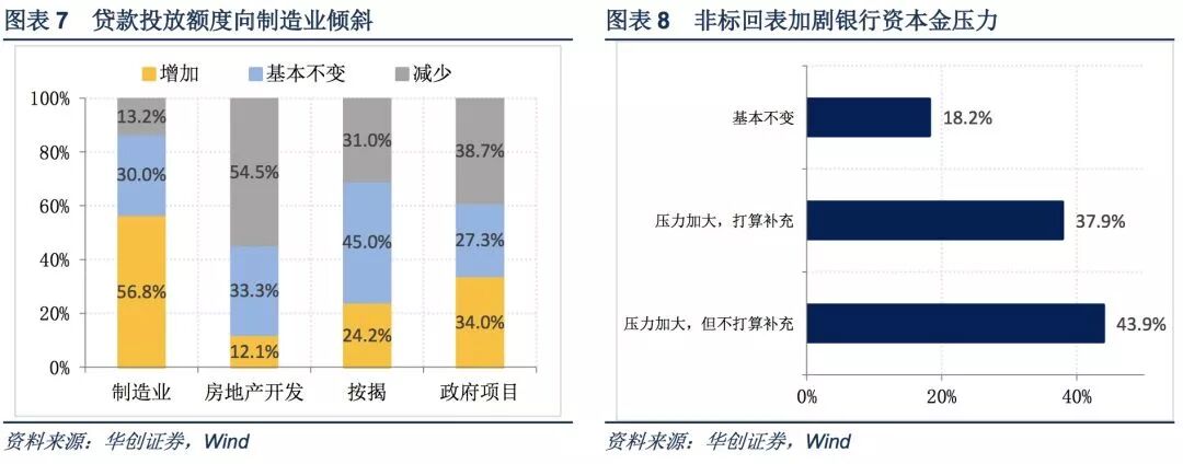 46%的信贷官认为,在监管严格限制非标融资情况下,考虑到表外转表内的影响,将增加表内信贷。但是也有接近30%的信贷官表示,在表内额度受压制并且投向受限的情况下,非标回表对表内信贷基本无影响。非标投资大部分流向了城投公司与房地产企业,在现有监管下回表难度非常大,某股份行信贷官表示,在非标回表几乎不可能的情况下,将会采取减少资产的方式来应对。某城商行信贷官表示该行表外理财投资非标的新业务都停了,但未到期的非标暂时不受影响。较确定的是,82%的信贷官均表示,非标回表将加剧银行资本金压力,这当中有46%的信贷官预计该行有补充资本金的打算。某城商行信贷官表示,资本金受限将使得该行对项目的选择更加谨慎,对项目收益率要求更高。