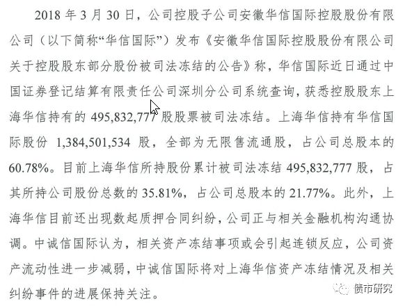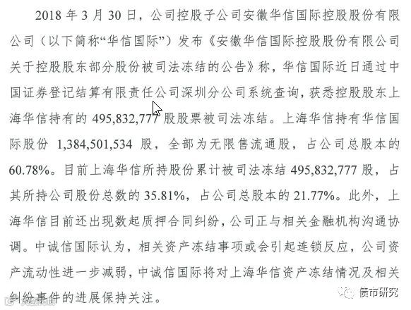 3月29日晚,安徽华信国际控股股份有限公司(以下简称“华信国际”)公告称,近日通过中国证券登记结算有限责任公司深圳分公司系统查询,获悉公司控股股东上海华信集团有限公司(以下简称“上海华信”)持有的 495,832,777 股股票被司法冻结,具体事项如下: