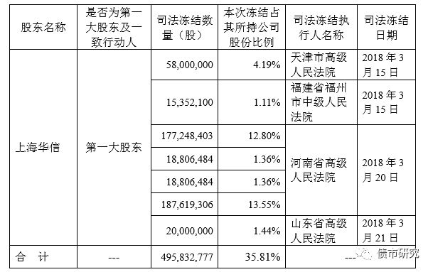 华信国际称,上海华信持有公司股份 1,384,501,534 股,全部为无限售流通股,占公司总股本的 60.78%。截至本公告日,上海华信所持股份累计被司法冻结 495,832,777股,占其所持公司股份总数的 35.81%,占公司总股本的 21.77%。