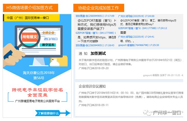 按照海关总署56号和113号公告,9月30日起,跨境电商进出口的申报数据全部需进行电子签名。为保障企业顺利使用数字签名,广州“单一窗口”早在6月就已经展开企业走访、宣讲和调研工作,并为企业提供客户端签名、加密机软证书签名、远程签名等多种解决方案,向企业提供测试环境开展在线测试联调,24小时技术热线排查、解答企业使用中出现的问题。9月30日,切换工作顺利平稳,企业业务没有受到太大影响。