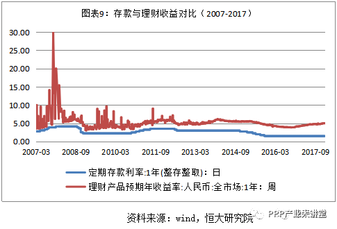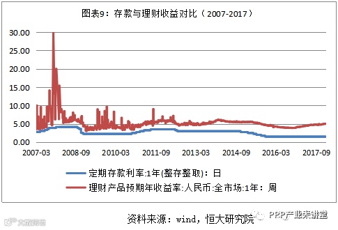不难看出,存款基准利率的上限规定致使银行理财成为了利率市场化的先遣军以及争夺负债资金的竞争性工具。如图9所示,从2007年以来,商业银行理财产品预期年收益率均大幅度高于1年期整存整取定期存款利率。理财资金年度余额规模2010年-2015年维持在40%-70%高增长率水平(图8)。其内部结构中,非保本理财自2013年开始,一直处于60%以上的占比,成为了理财资金的绝对主力。与此同时,我们也观察到,自2014年开始,受监管收紧影响,理财余额增速开始出现趋势性下滑,甚至是负增长。