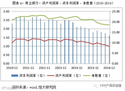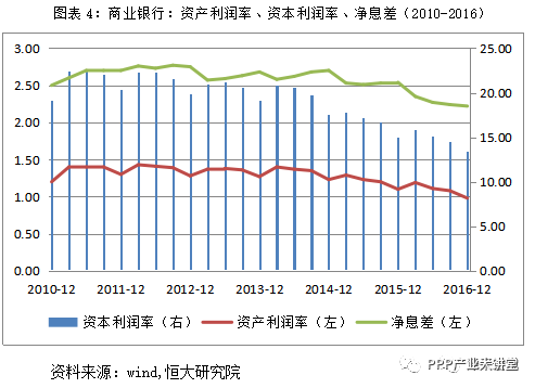 另一方面,受实体经济增速下滑影响,企业债权投资回报率下降,商业银行传统信贷业务利差不断收窄,高收益、高流动性、低风险资产越来越稀缺。“资产荒”压力下,为追求更高收益,拓展投资空间,解决信贷投向单一、回报率低等问题,商业银行开始将理财或自营资金委托给外部机构进行管理。从下图可以看出,从2010年至2017年第三季度,商业银行的资产利润率、净息差、资本利润率,分别从1.2%、2.5%、19%下滑至1.0%、2.1%、14%,几乎一路下行。