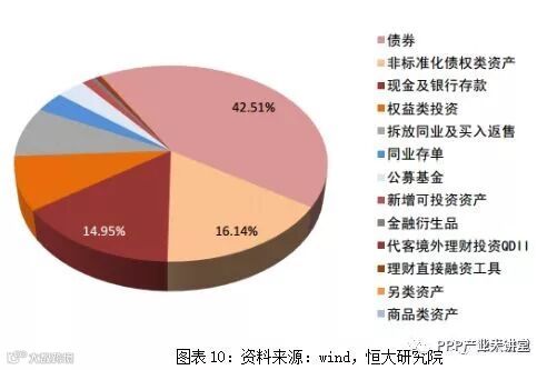 根据基金业协会发布的《证券期货经营机构私募资产管理业务2016年统计年报》,基金子公司通过信托贷款、委托贷款、收益权等方式进行的债权投资规模为3.95万亿,占比37%;投资基金专户、证券资管、银行理财、信托、私募等规模为3.47万亿,占比32.3%;投资股票、债券、基金等证券规模1.38万亿,占比12.8%;投资资产收益权5052亿,占比4.7%;股权投资规模4030亿,占比3.8%;同业存款及现金规模3105亿,占比2.9%。基金公司专户产品投资情况表显示,基金公司专户投资最高品种为债券,合计3.86万亿,占比63.7%;投资股票6826亿,占比11.3%;证券投资基金4091亿,占比6.7%;同业存款3478亿,占比5.7%;境外投资及现金分别为1769亿、1525亿,各占比2.9%、2.5%。可以看出,基金公司专户中产品配置亿债券、股票、基金、同业存款投资为主。券商方面,截至2016年底,证券公司集合计划个人投资者委托资金9126亿,机构投资者委托资产规模1.21万亿。定向资管计划中,个人委托资金416亿,机构投资者委托规模为14.63万亿,占定向资管计划规模的99.7%;定向资管计划投资者,银行和信托公司合计委托规模12.68万亿,占定向资管计划规模的86.4%。两类中,集合计划主要投向债券、股票、协议或定期存款、信托计划、基金,分别占总投资规模的63.2%、7.6%、6.8%、5.8%和5.4%。主动管理定向业务以债券、信托计划、股票投资为主,分别投资1.56万亿、2267亿、1792亿,占比合计为70.2%。
