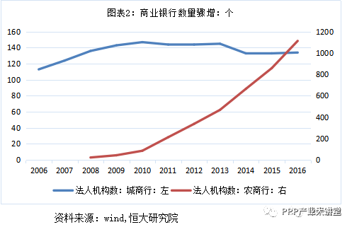 常态条件下,商业银行通过负债的规模、期限、价格等因素来决定资产的配置策略。自商业银行市场化经营以来,尤其自利率市场化和金融自由化以来,存款竞争愈发激烈,股份制银行以及中小型金融机构其负债能力较弱,只有通过不断发行理财产品、同业存单的形式来获取负债资金。于是,资金成本不断被推高。为满足底层对客负债收益,商业银行只有不断追求变相投资高风险权重、高收益资产。Wind数据显示,2006年到2016年,城市商业银行的数量由113家增长到134家。2008年到2016年,农村商业银行的数量由22家快速增长到1114家(图表2)。尽管大型国有商业银行依然占主导地位,但股份制银行和地方城市商业银行、农村商业银行的崛起在边际上极大地加剧了银行之间的资金争夺竞争。利率市场化导致的存款理财化提高了负债成本,商业银行需要提高资产收益率以覆盖成本,自身条件受限前提下,只好寻求委外。