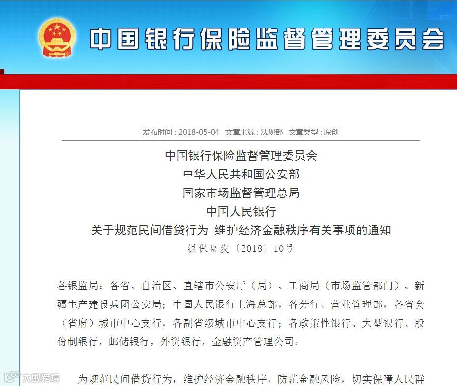 银保监会5月4日发布《关于规范民间借贷行为 维护经济金融秩序有关事项的通知》