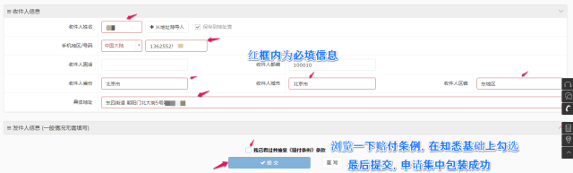 10,填写收件人信息,如建立地址簿,可从地址簿中直接导入,阅读赔付条例,没有问题请知悉基础勾选,点击提交