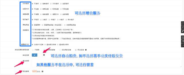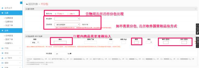 7,如需要将货物进行分箱请选择分包,如不分包请选择国家及运输方式。