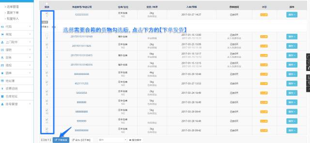 6,勾选同一仓库的货物,确认无误后点击【下单发货】