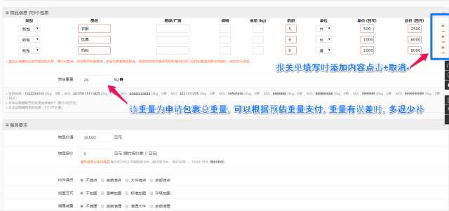 8,可在最右边添加商品内容+或是取消-,预估重量显示所有包裹的总重量。