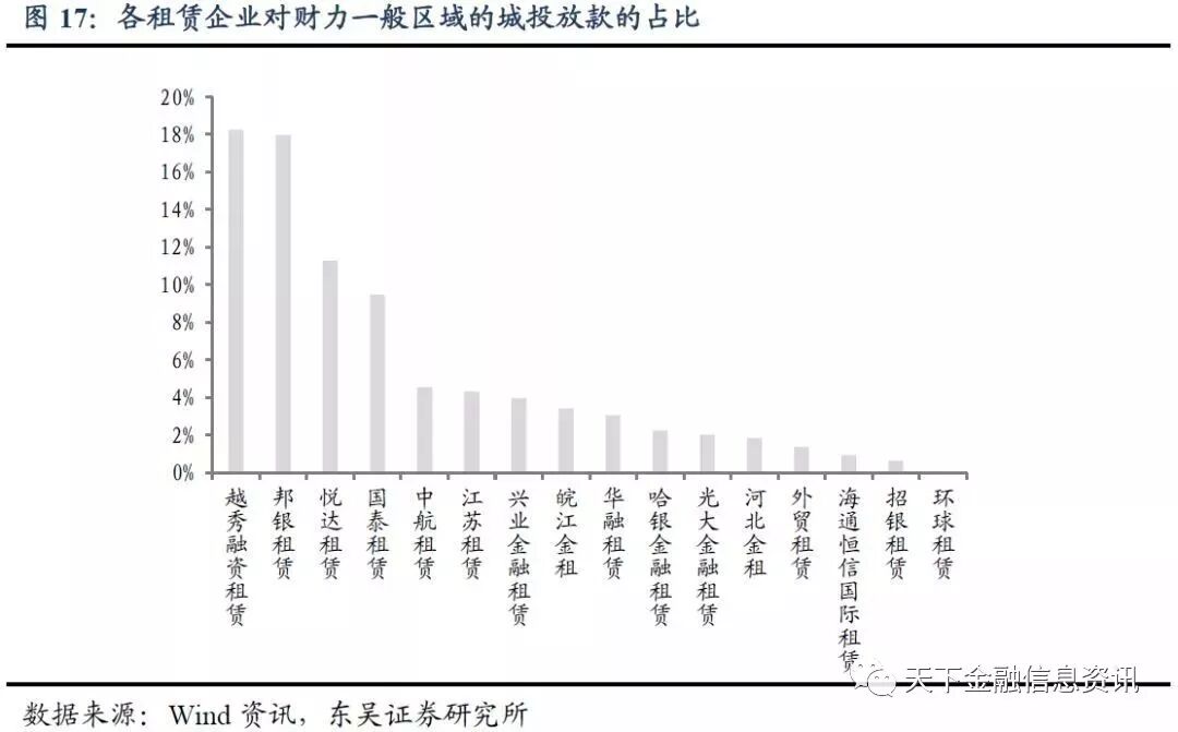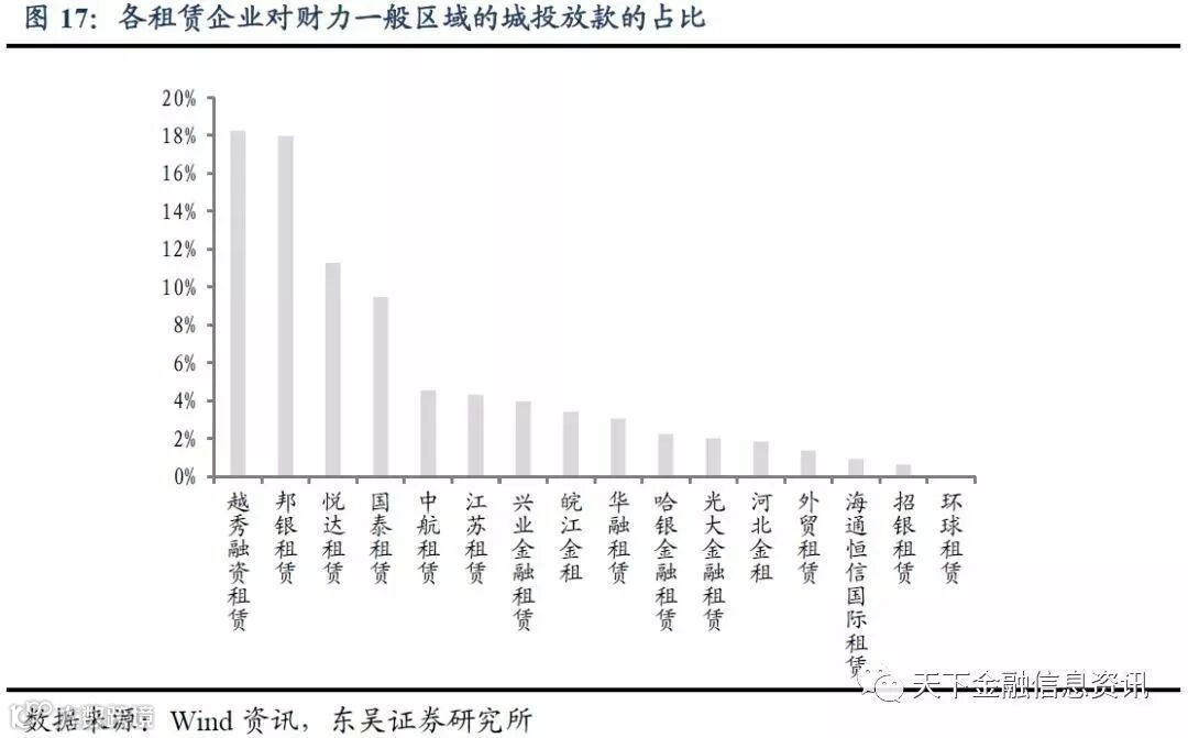 首先,根据发债主体公告,我们可以获得租赁业各发债主体对城投客户[5]放款的占比。如下图,邦银租赁、悦达租赁、越秀融资租赁、光大金融租赁、皖江金租、中信富通、江苏租赁、哈银金融租赁、国泰租赁和建信租赁对城投的放款占比均在30%以上。
