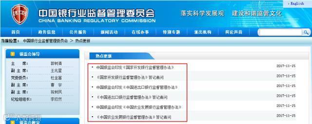 11月15日,银监会官网正式发布《国家开发银行监督管理办法》、《中国进出口银行监督管理办法》和《中国农业发展银行监督管理办法》。这是三大政策性银行成立23年来首次迎来专门监管办法。