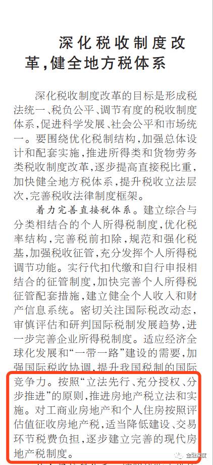 财政部长肖捷今日在人民日报撰文称:按照“立法先行、充分授权、分步推进”的原则,推进房地产税立法和实施。对工商业房地产和个人住房按照评估值征收房地产税,适当降低建设、交易环节税费负担,逐步建立完善的现代房地产税制度。