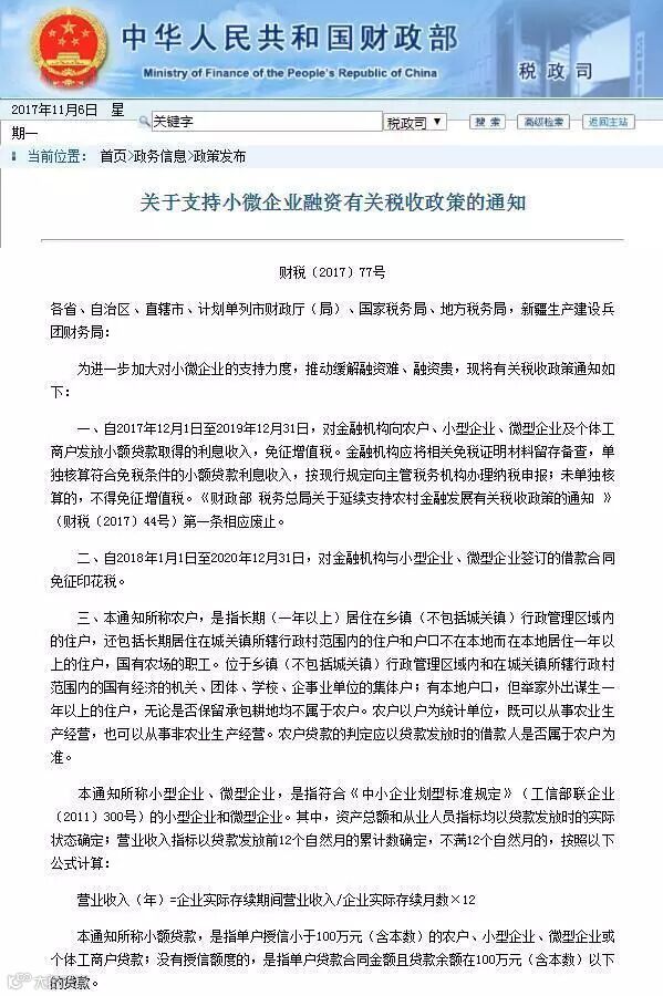 导读:财政部官网发布消息称,2017年12月1日至2019年12月31日,对金融机构向农户、小型企业、微型企业及个体工商户发放小额贷款取得的利息收入,免征增值税;2018年1月1日至2020年12月31日,对金融机构与小型企业、微型企业签订的借款合同免征印花税;2018年1月1日至2020年12月31日,继续对月销售额2万元(含本数)至3万元的增值税小规模纳税人,免征增值税。