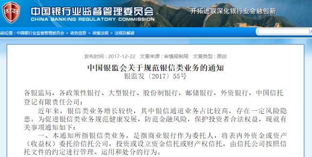 摘要:《通知》指出,对实质承担信用风险的银信类业务,商业银行应准确计提资本和拨备。信托资金不得违规投向房地产、地方政府融资平台、股市、产能过剩等限制或禁止领域。信托公司不得为委托方银行规避监管规定违法违规提供通道服务。