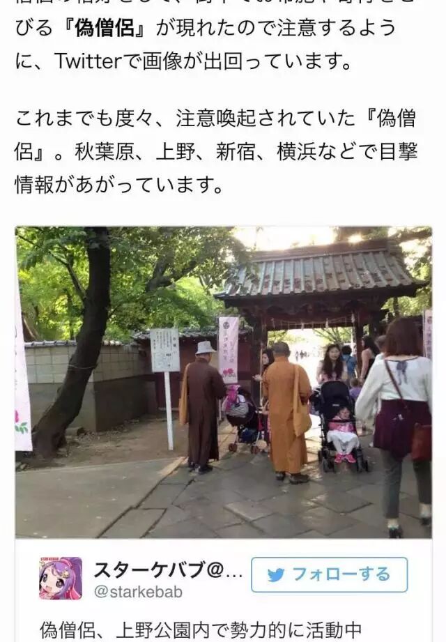 图片中的建筑是否觉得很熟悉呢,上野公园。日本tbs电视台今日报道。两名冒充僧侣的亚洲籍人士在上野公园赏花地,专找外国人和日本人以募金为名兜售平安符和手链,两样东西要1千日元。他对欧美人说是日本人,对日本人说是不丹人。最后采访方确认是中国人。他惯用此伎俩行骗,因为属于违法行为多次被驱除。