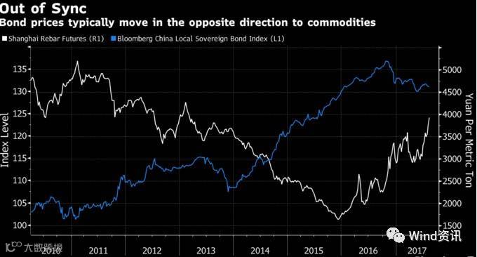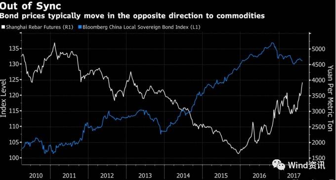 上周,上海钢铁行业期货价格飙升至2013年以来最高水平,沪铜和铝也涨至多年高位,但是债市目前还没有出现巨大波动。从历史来看,二者走势呈负相关。
