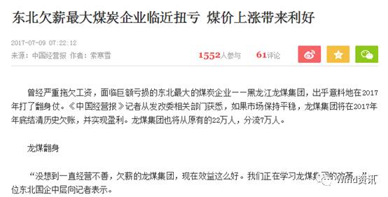 《中国经营报》此前有一则报道很有意思:曾经严重拖欠工资,面临巨额亏损的东北最大的煤炭企业——黑龙江龙煤集团,出乎意料地在2017年打了翻身仗。如果市场保持平稳,龙煤集团将在2017年年底结清历史欠账,并实现盈利,这将是2011年以来的第一次。