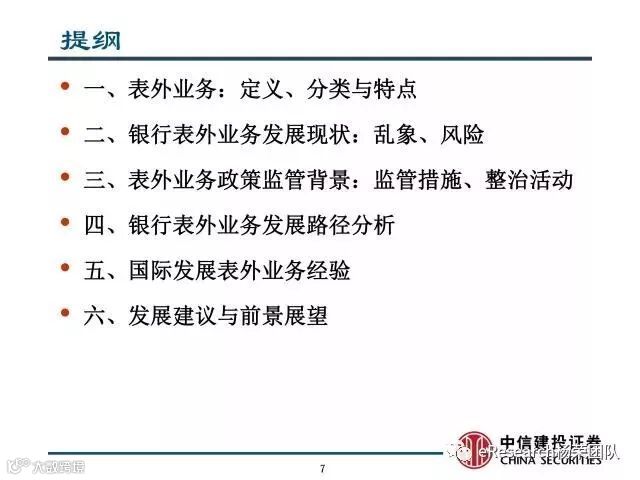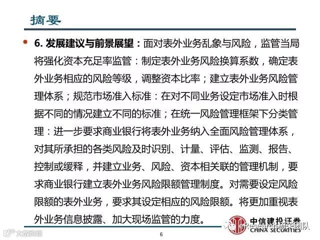 6、发展建议与前景展望:面对表外业务乱象与风险,监管当局将强化资本充足率监管:制定表外业务风险换算系数,确定表外业务相应的风险等级,调整资本比率;建立表外业务风险管理体系;规范市场准入标准:在对不同业务设定市场准入时根据不同的情况建立不同的标准;在统一风险管理框架下分类管理:进一步要求商业银行将表外业务纳入全面风险管理体系,对其所承担的各类风险及时识别、计量、评估、监测、报告、控制或缓释,并建立业务、风险、资本相关联的管理机制,要求商业银行建立表外业务风险限额管理制度。对需要设定风险限额的表外业务,要求其设定相应的风险限额。将更加重视表外业务信息披露、加大现场监管的力度。